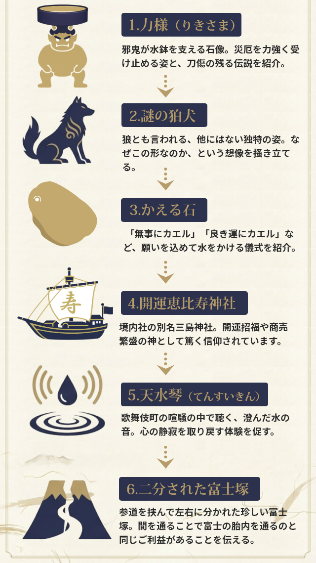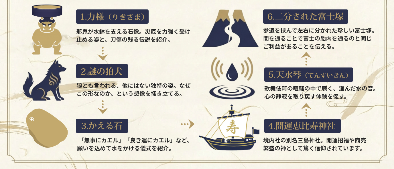 「稲荷鬼王神社の七不思議」のような切り口で、一つひとつの見どころに物語を与えます。